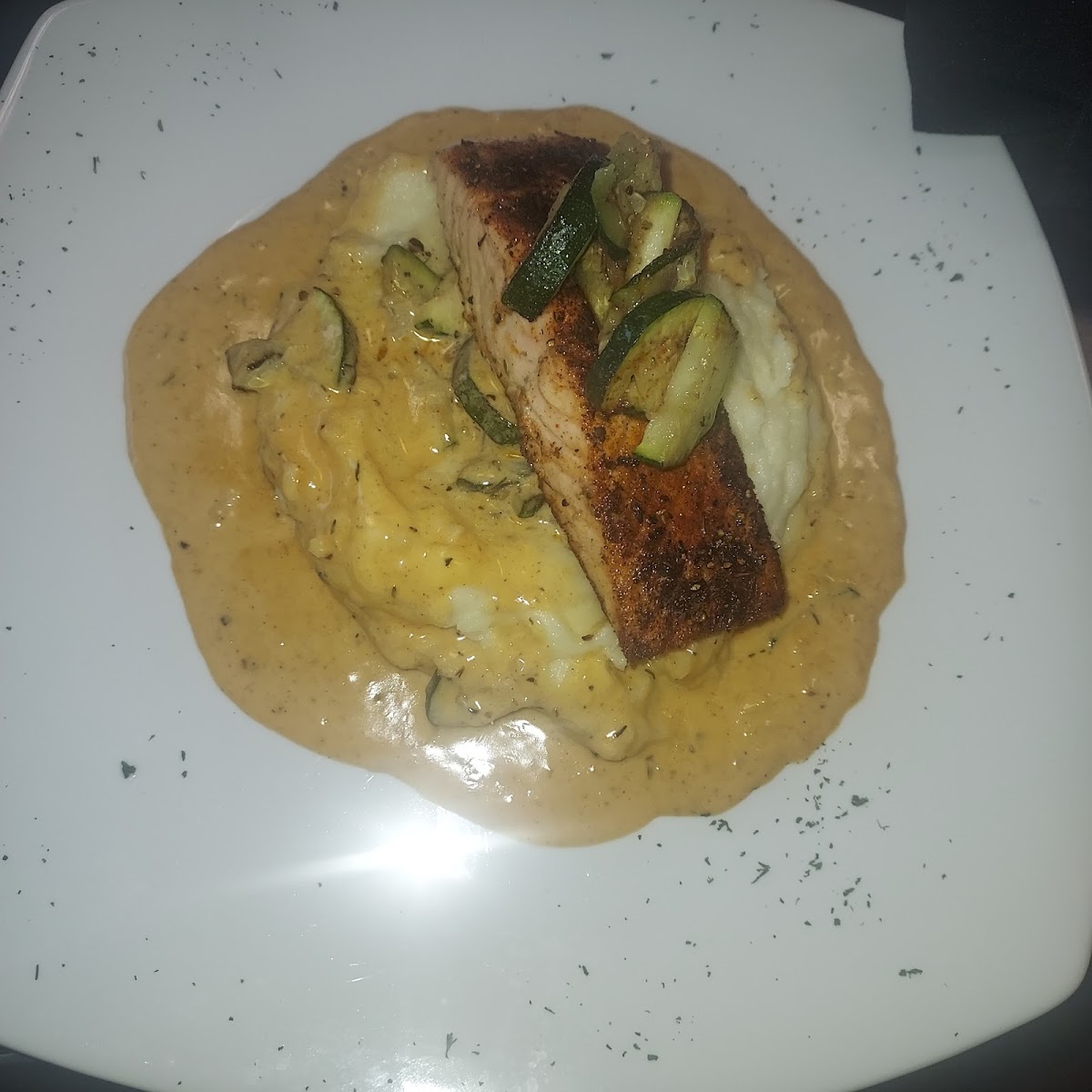“ First time coming and many more soon! Our server Kevin was sweet and took good care of us! We ordered the Chimichurri Ribeye and the Seared Salmon. The mash potatoes were whipped nicely and very creamy! The Lemon Caper Sauce was delicious and was paired nicely with the salmon. Both meats were juicy and melts in your mouth. Definitely worth the price and hope this place becomes a staple in our community. ”